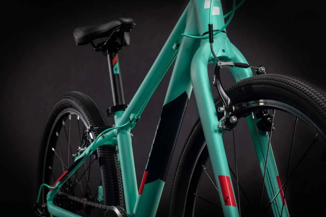 Der Rahmen des Acid 240 besteht aus denselben hitzebehandelten 6061er Aluminiumrohrsätzen wie der unserer Erwachsenen Mountainbikes und ist demnach genauso robust und stabil. Wir haben seine Proportionen und das Gewicht aber auf die Anforderungen von Kindern abgestimmt. Zudem können Schutzbleche montiert werden – und ein Flaschenhalter, damit die Kids unterwegs immer ausreichend mit Flüssigkeit versorgt sind. Dank dem guten, auf hohen Fahrspaß ausgelegten Handling tanken die Youngsters jede Menge Selbstvertrauen. Und weil sich Unfälle nicht immer vermeiden lassen, haben wir uns für ein einfach austauschbares Schaltauge entschieden, was aufwendige Reparaturen nach einem Sturz oder Aufprall erspart.