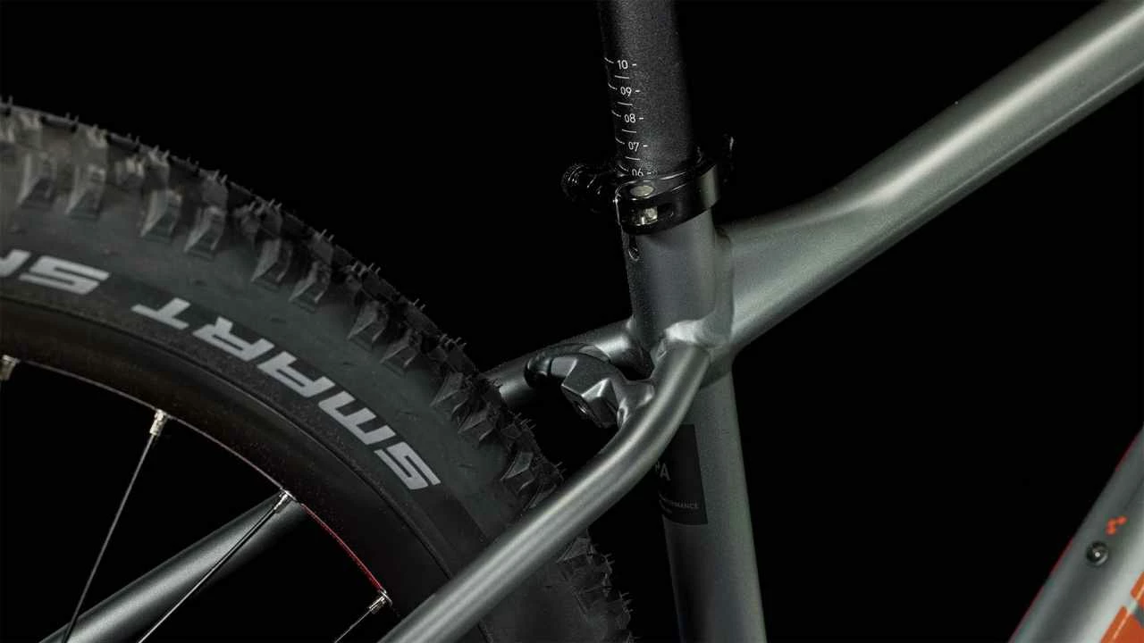 Der analoge Rahmen besticht durch seine ultra-cleane Optik. Dabei handelt es sich um eine durch einen glatten Schweißprozess hergestellte Verbindung zwischen Steuerrohr und Sattelstützenprofil. Wir haben uns auch für ein angeschraubtes Tretlager entschieden und die Kabel nach innen verlegt, damit sie länger funktionieren und einfacher zu reparieren sind. Es gibt außerdem eine flach montierte Scheibenbremsaufnahme, die nahtlos in die seitliche Seitenständeraufnahme integriert ist. Zudem sind Befestigungspunkte für ACID-Schutzbleche und Gepäckträger vorhanden. Die überarbeitete Geometrie hat ein niedrigeres Oberrohr und ein konifiziertes Steuerrohr für ein sichereres Handling. Es gibt auch viel Platz für 2,25-Zoll-Reifen, die breit und griffig sind und bequem rollen. Auch das SizeSplit-System haben wir weiter ausgebaut. So findest du garantiert die perfekte Kombination aus analogen Laufrädern und Rahmengröße. Das Fahrgestell kann auch mit einer versenkbaren Sattelstütze ausgestattet werden, da die Anforderungen mit zunehmendem Fahrkönnen steigen.