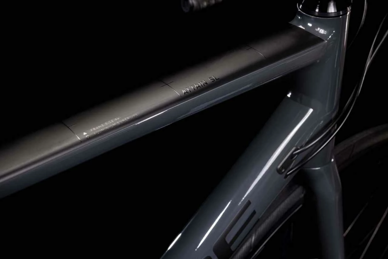 Jeder sollte seinen Lieblingssport maximal genießen können, deshalb haben wir bei der Konzeption des Attain Rahmens aus 6061er Aluminium (inklusive Aufnahmen für Scheibenbremsen) viel Wert auf Komfort und Performance gelegt. Durch die doppelt konifizierten Rohre wurde, wo möglich, Gewicht eingespart, selbstverständlich ohne Einbußen in Sachen Stabilität und Steifigkeit. Das konische Steuerrohr und Steckachsen vorne und hinten sorgen für ein superpräzises Lenkverhalten und maximale Kraftübertragung. Außerdem reduzieren die schlanken Sitzstreben und die Vollcarbongabel etwaige Vibrationen vom Straßenbelag und erhöhen so den Fahrkomfort spürbar. Mit unserem Smooth Welding Verfahren konnten wir die Rohrverbindungen zudem glatt und clean gestalten, was dem Chassis seinen edlen Look verleiht.